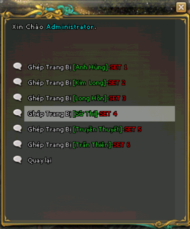 - Hệ thống trang bị của máy chủ giai đoạn đầu gồm có 6 bộ trang bị được bán bằng Bạc Thường Và Kim Nguyên Bảo (Đại) tại NPC cửa hàng.