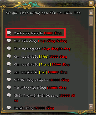 - Cửa hàng Trang Bị được bán bằng Bạc Thường Và Kim Nguyên Bảo (Đại) Danh Vọng Trang Bị Chỉ định.